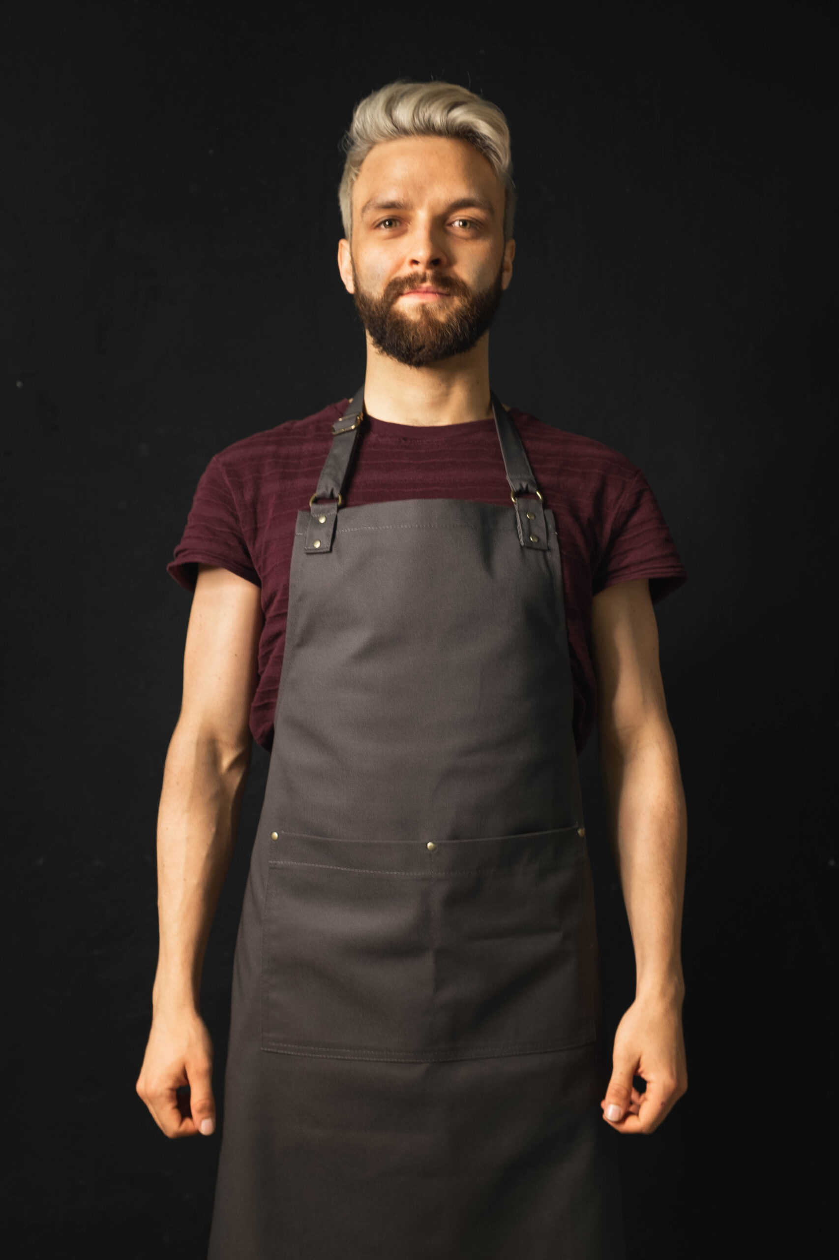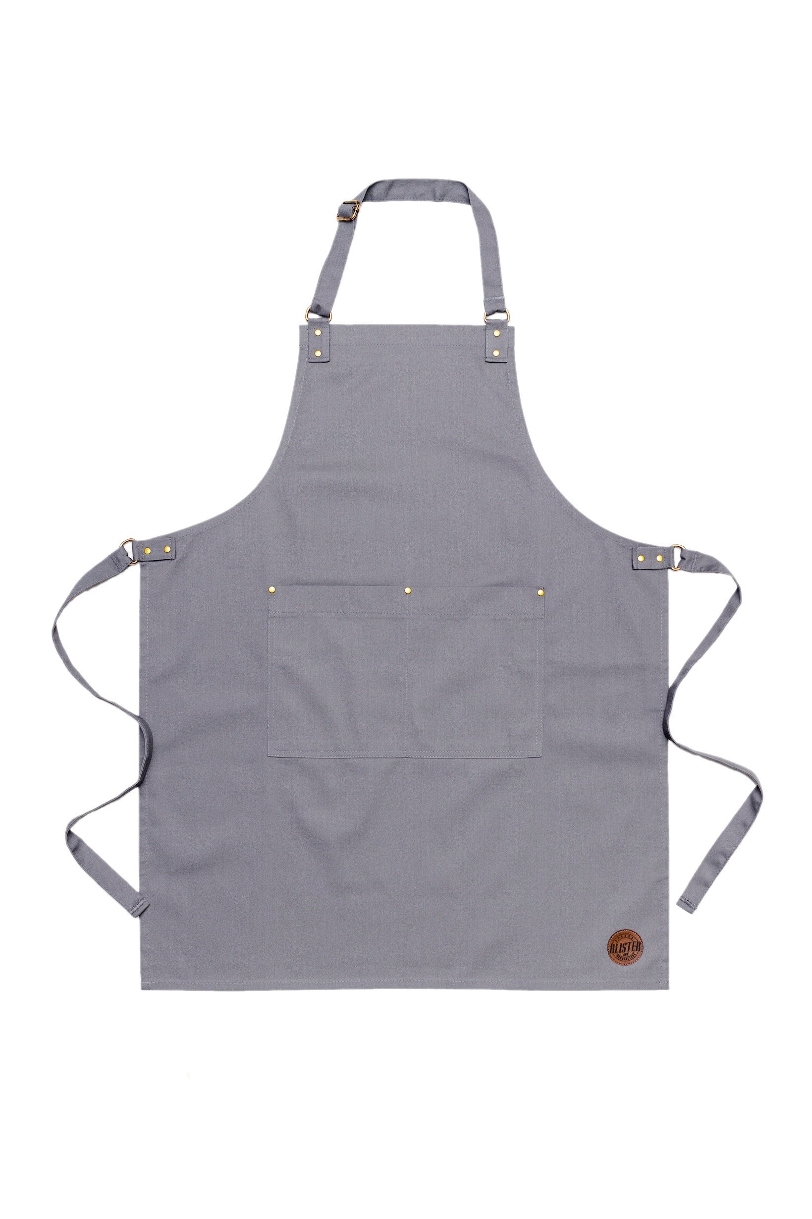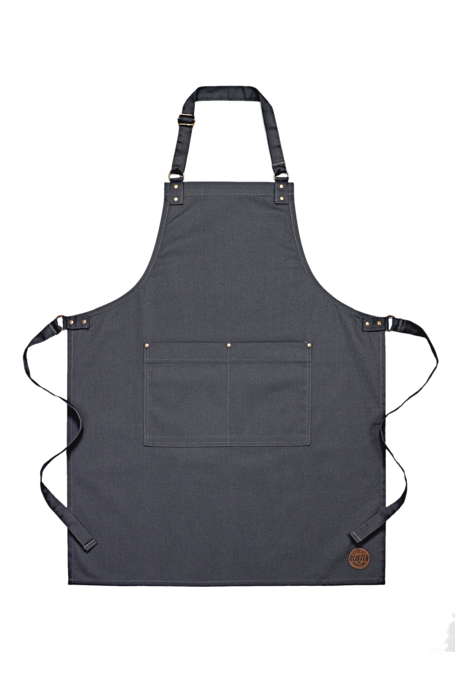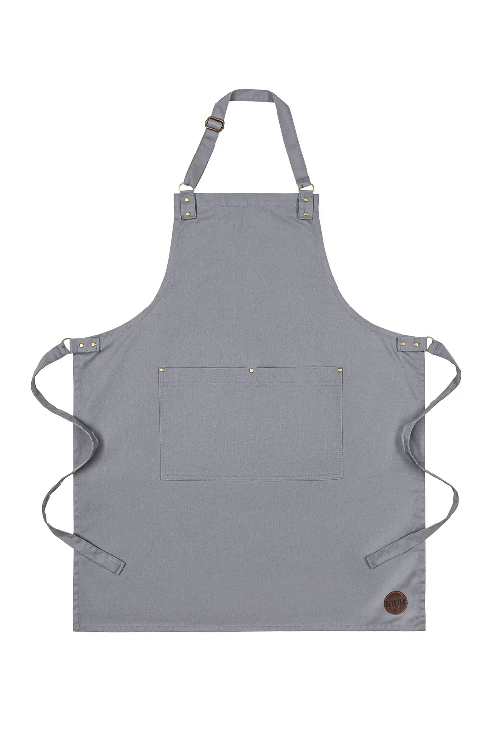 Prosty minimalistyczny fartuch. Praktyczna podwójna kieszeń wzmocniona nitami.  Pasek z regulacją na szyi. Fartuch idealny dla każdego. Może się sprawdzić jako fartuch barmański,  fartuch florystyczny lub fartuch kuchenny.