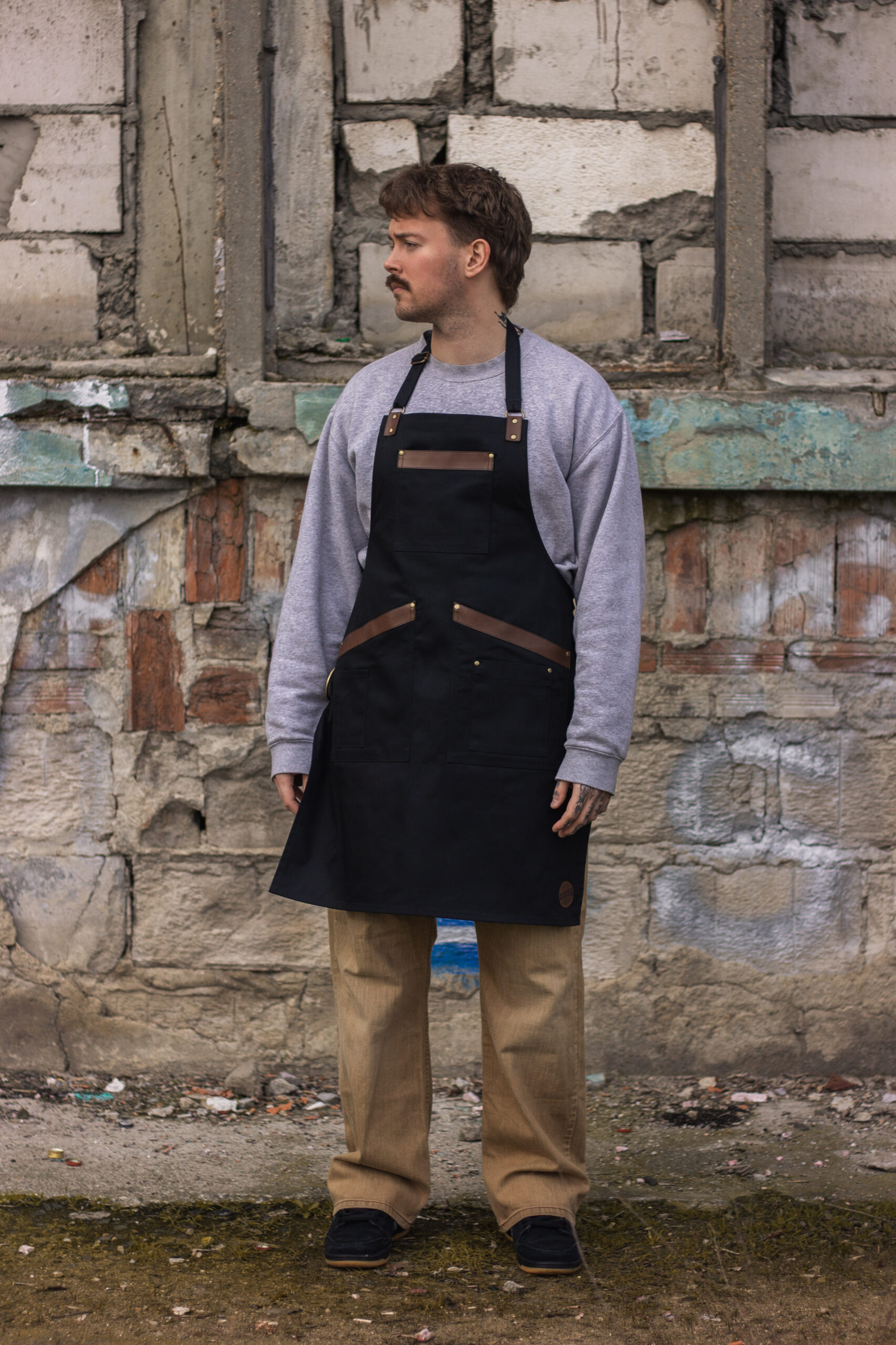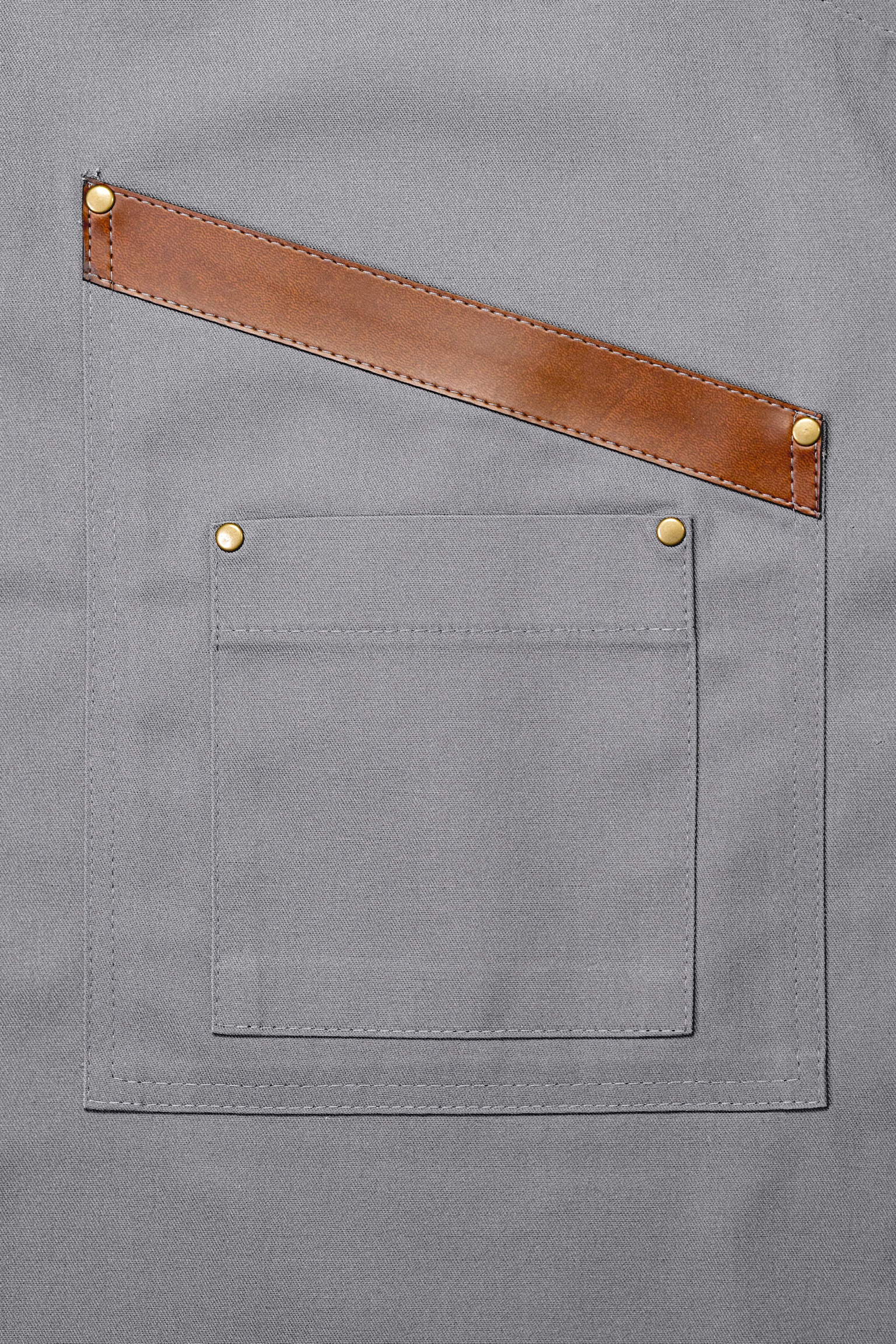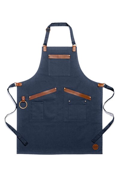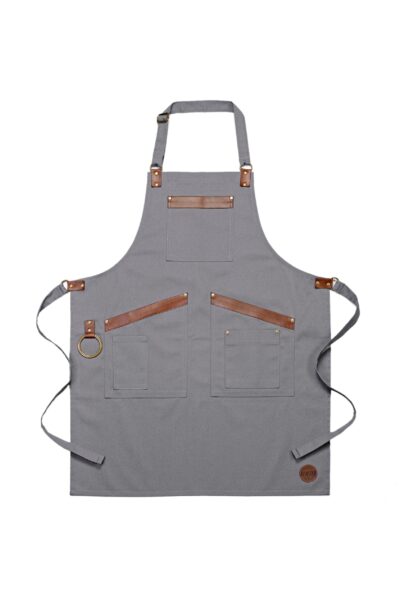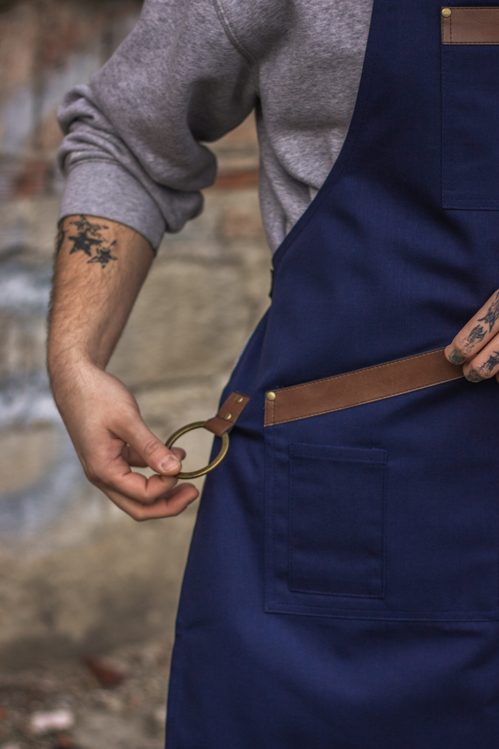 Stylowy fartuch z dużymi skośnymi kieszeniami, które pomieszczą najpotrzebniejsze przybory. Dodatkowa kieszonka na piersi. Specjalne metalowe kółeczko do zawieszenia ścierki lub otwieracza. Wzmocnienia metalowe w kolorze starego złota, które dodają szyku, ale i wzmacniają konstrukcję. Pasek na szyi ma dodaną regulację, aby każdy mógł dopasować fartuch do swojego wzrostu. Fartuch sprawdzi się w restauracji, za barem, w salonie fryzjerskim, barberskim, jako fartuch tatuatorski i kuchenny.