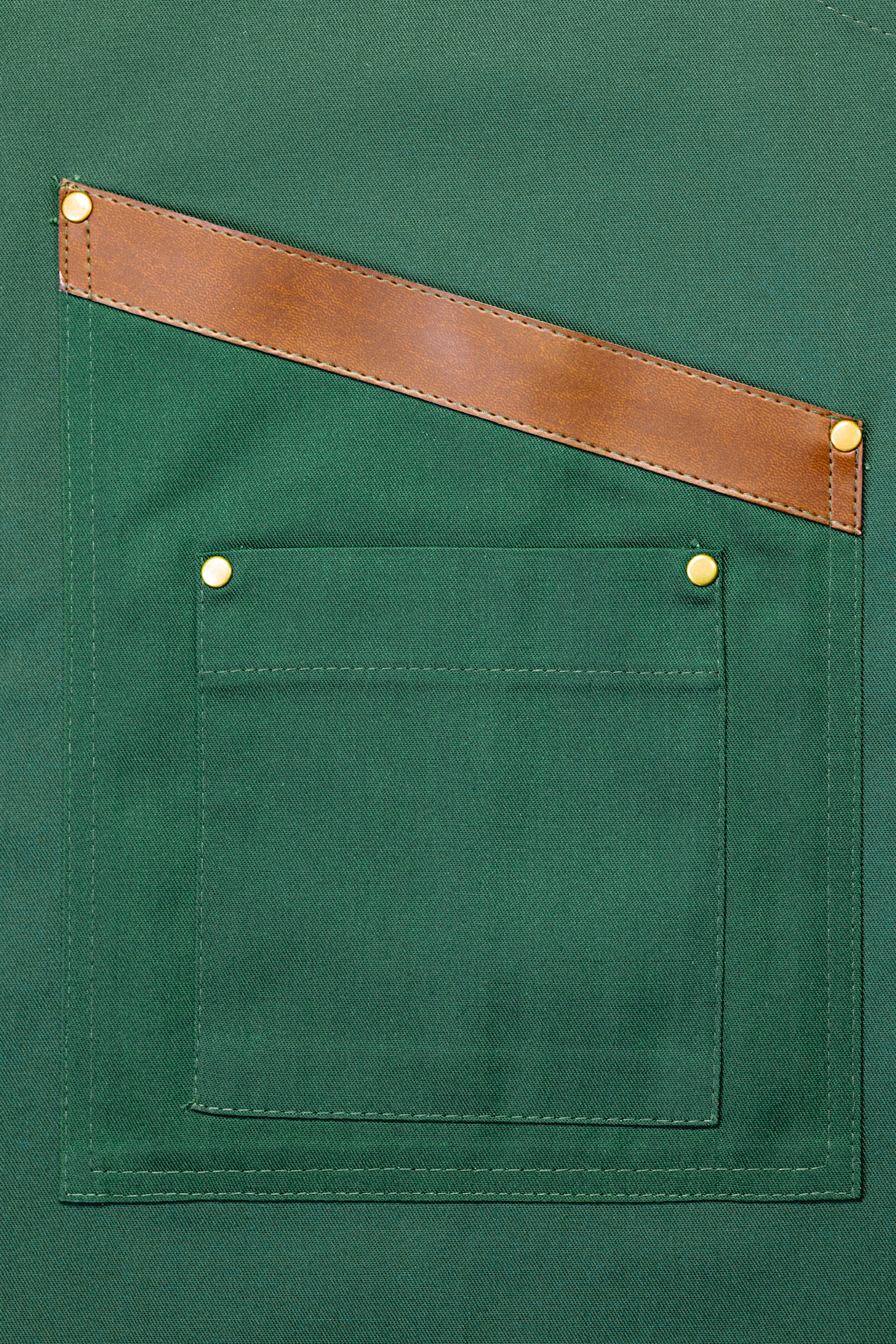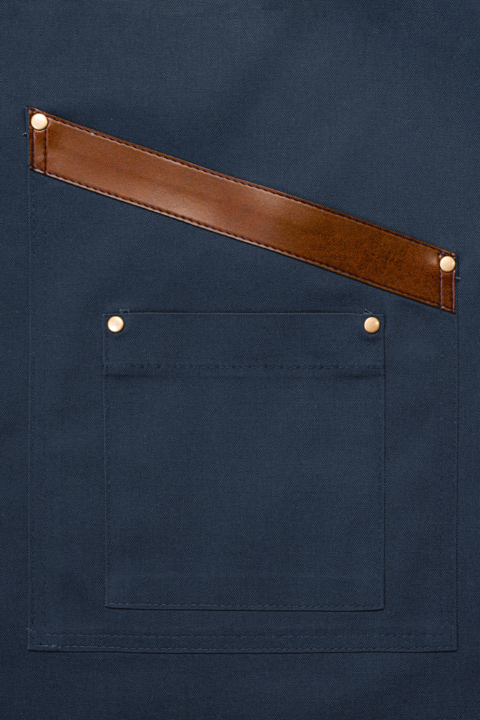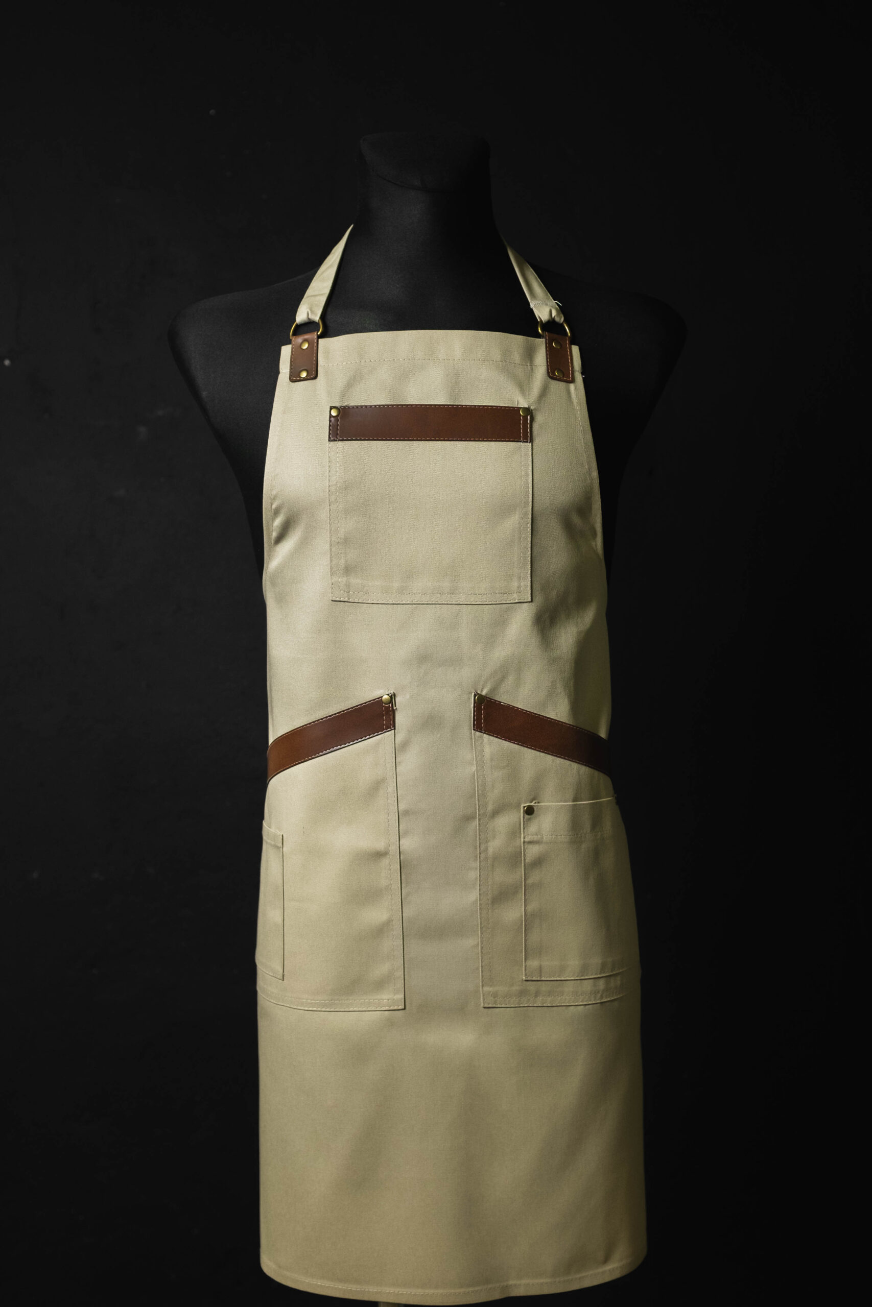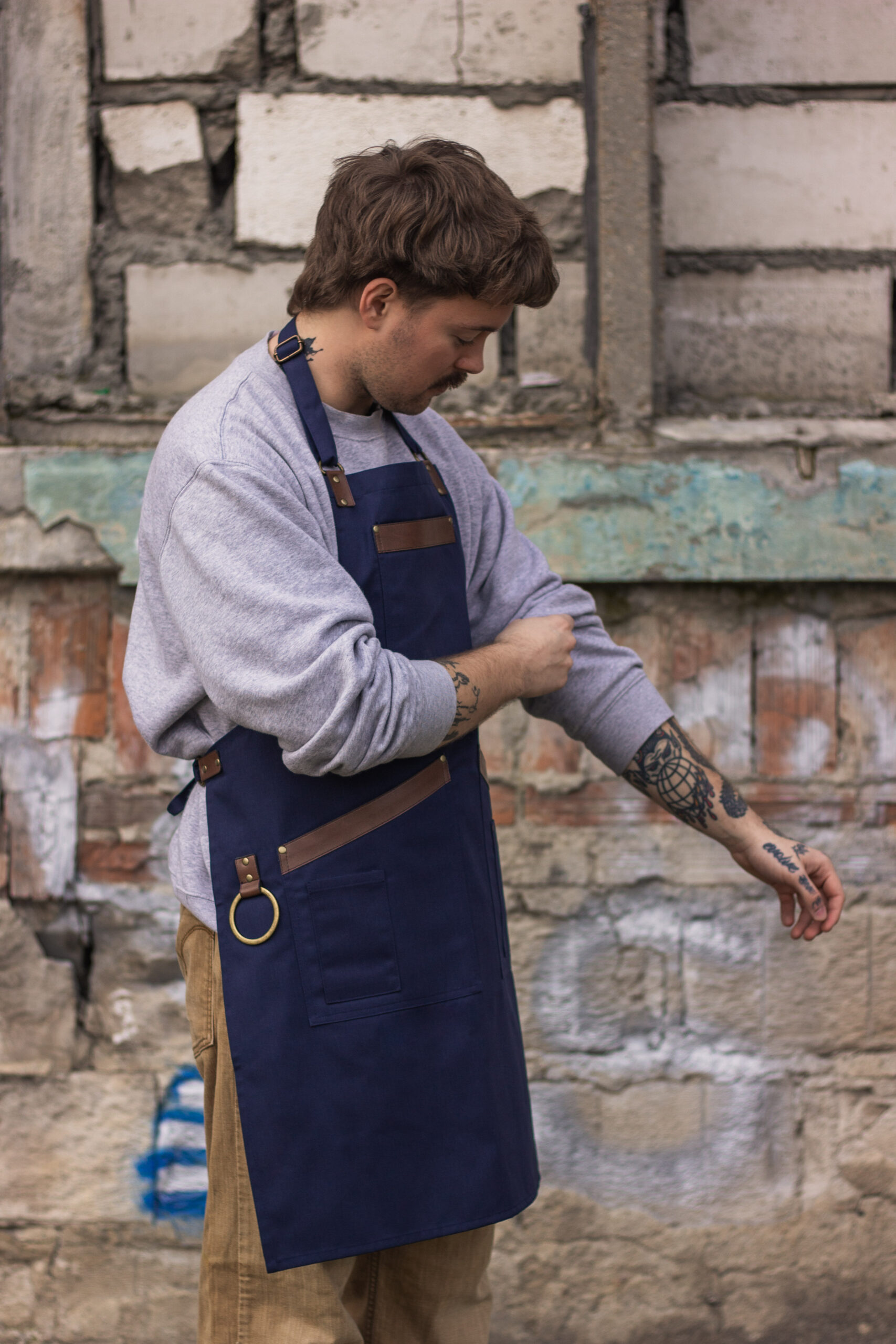 Stylowy fartuch z dużymi skośnymi kieszeniami, które pomieszczą najpotrzebniejsze przybory. Dodatkowa kieszonka na piersi. Specjalne metalowe kółeczko do zawieszenia ścierki lub otwieracza. Wzmocnienia metalowe w kolorze starego złota, które dodają szyku, ale i wzmacniają konstrukcję. Pasek na szyi ma dodaną regulację, aby każdy mógł dopasować fartuch do swojego wzrostu. Fartuch sprawdzi się w restauracji, za barem, w salonie fryzjerskim, barberskim, jako fartuch tatuatorski i kuchenny.