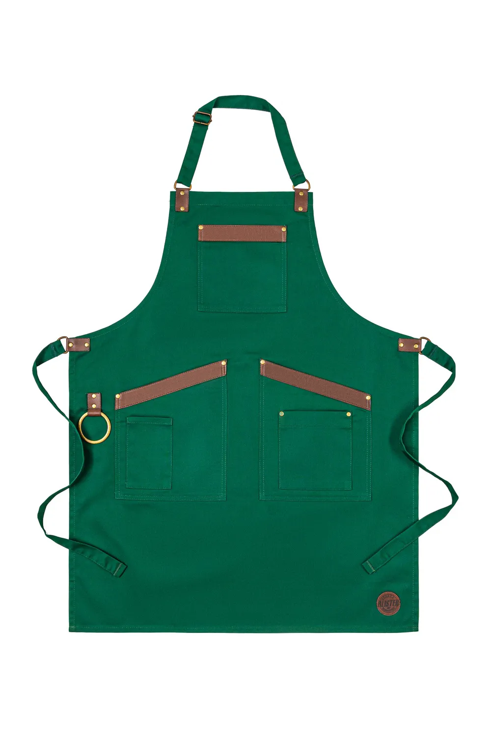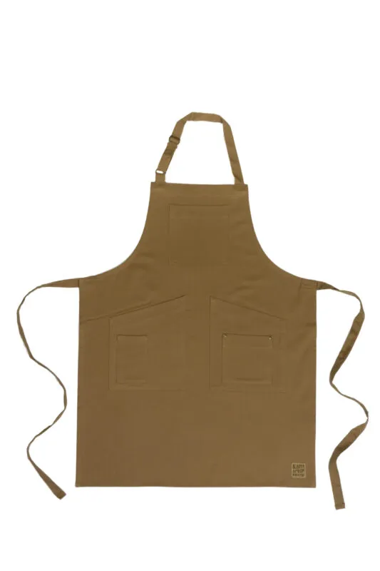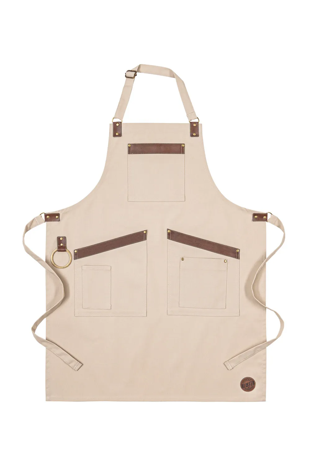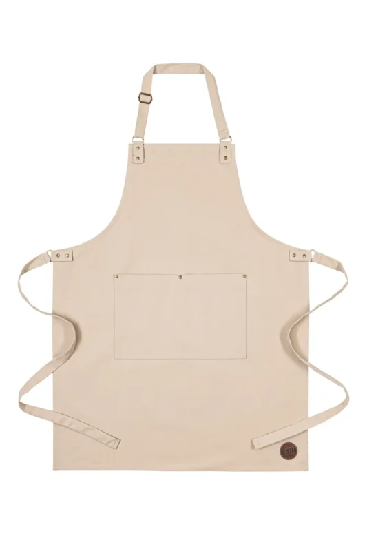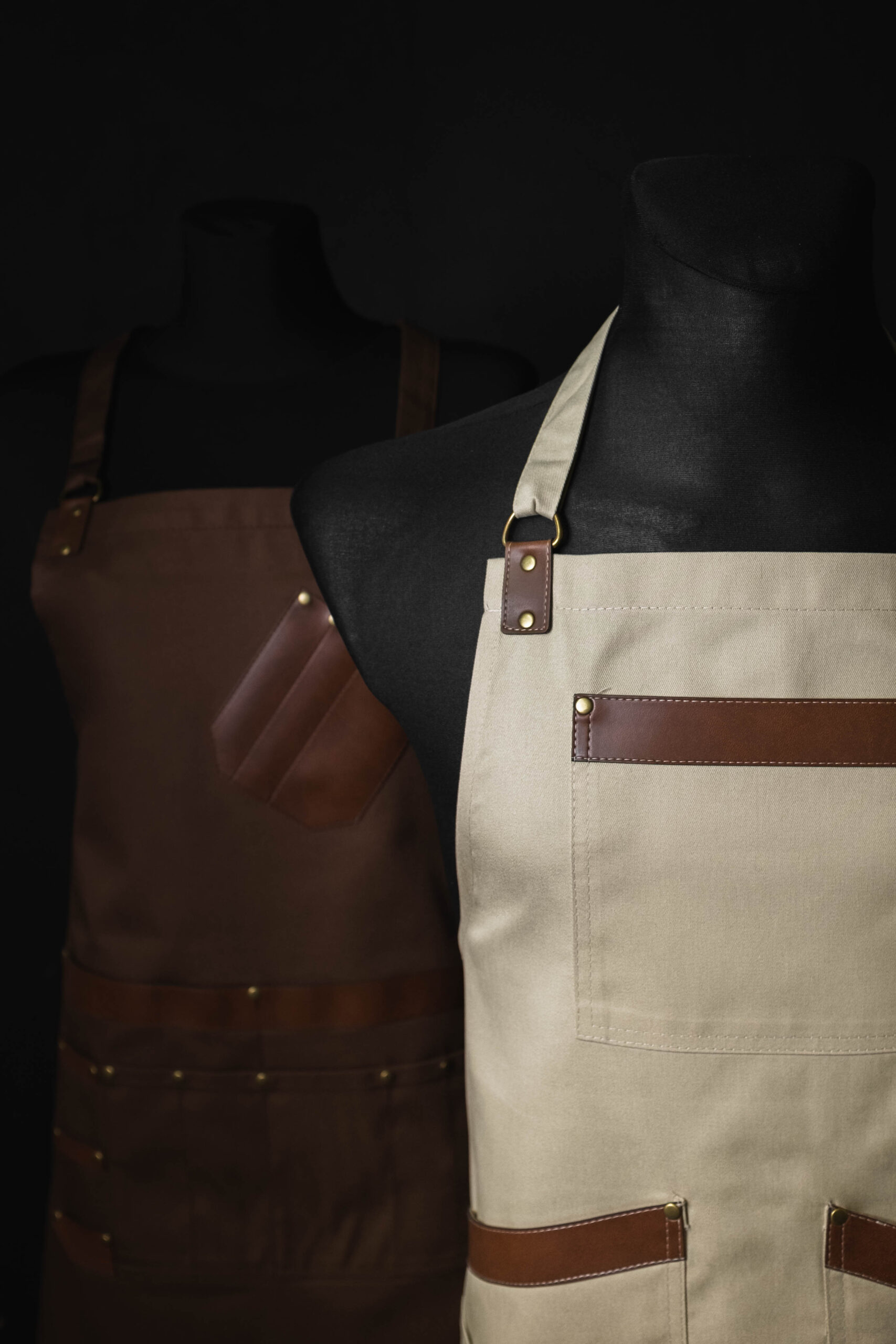 Stylowy fartuch z dużymi skośnymi kieszeniami, które pomieszczą najpotrzebniejsze przybory. Dodatkowa kieszonka na piersi. Specjalne metalowe kółeczko do zawieszenia ścierki lub otwieracza. Wzmocnienia metalowe w kolorze starego złota, które dodają szyku, ale i wzmacniają konstrukcję. Pasek na szyi ma dodaną regulację, aby każdy mógł dopasować fartuch do swojego wzrostu. Fartuch sprawdzi się w restauracji, za barem, w salonie fryzjerskim, barberskim, jako fartuch tatuatorski i kuchenny.