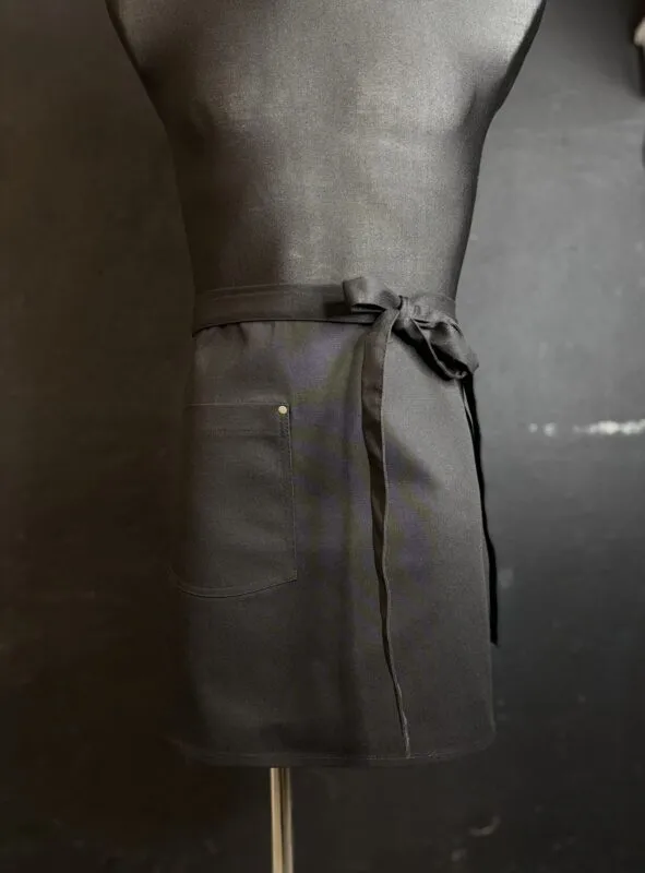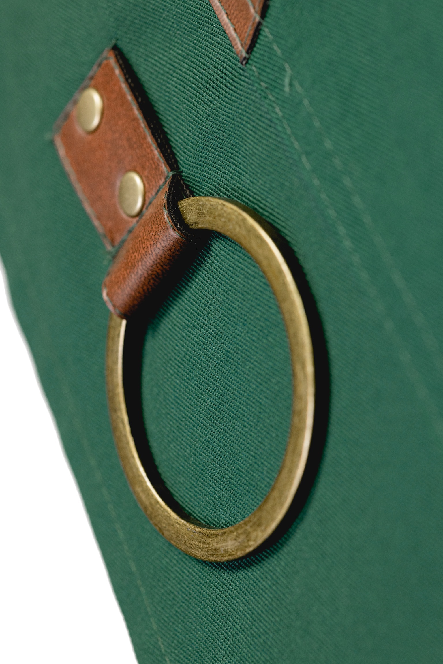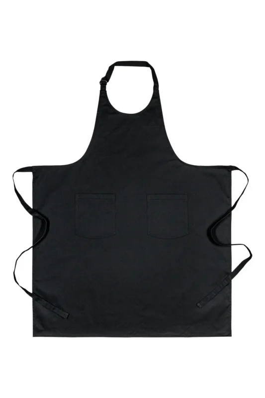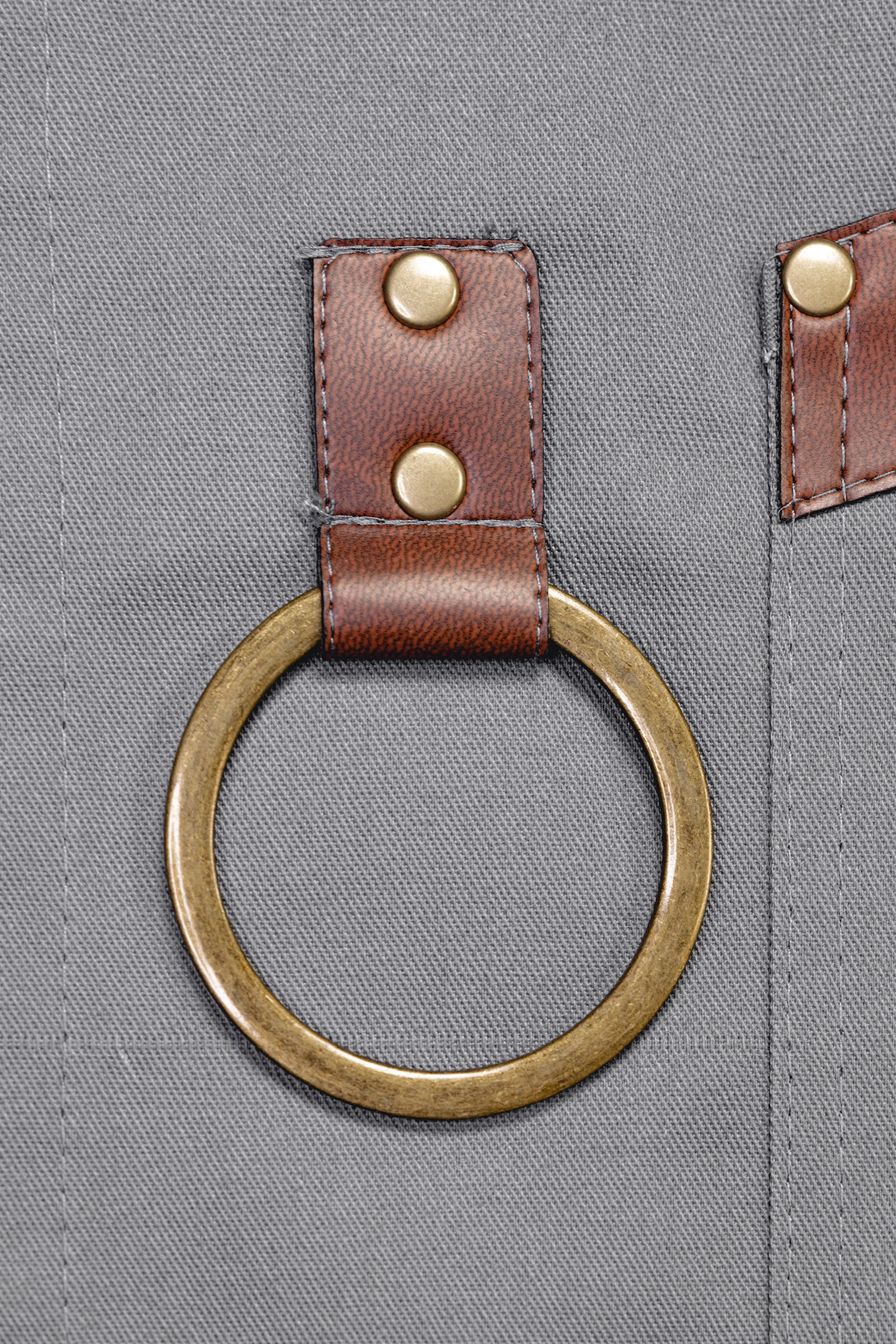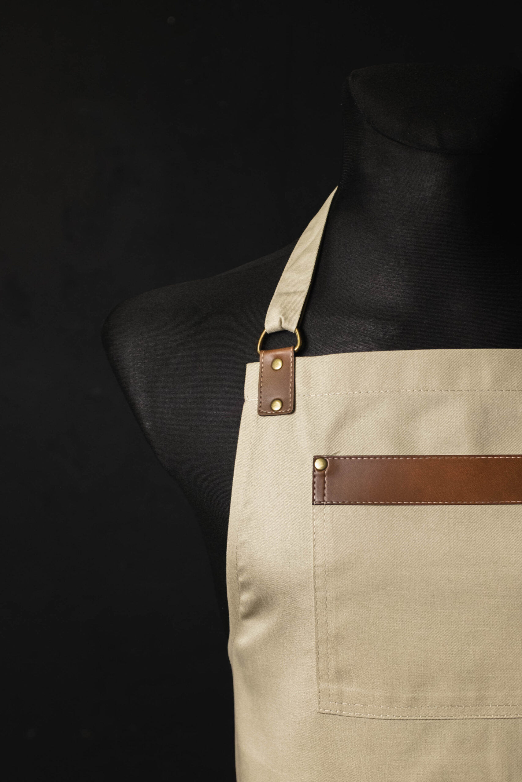 Stylowy fartuch z dużymi skośnymi kieszeniami, które pomieszczą najpotrzebniejsze przybory. Dodatkowa kieszonka na piersi. Specjalne metalowe kółeczko do zawieszenia ścierki lub otwieracza. Wzmocnienia metalowe w kolorze starego złota, które dodają szyku, ale i wzmacniają konstrukcję. Pasek na szyi ma dodaną regulację, aby każdy mógł dopasować fartuch do swojego wzrostu. Fartuch sprawdzi się w restauracji, za barem, w salonie fryzjerskim, barberskim, tatuatorskim i jako fartuch kuchenny.