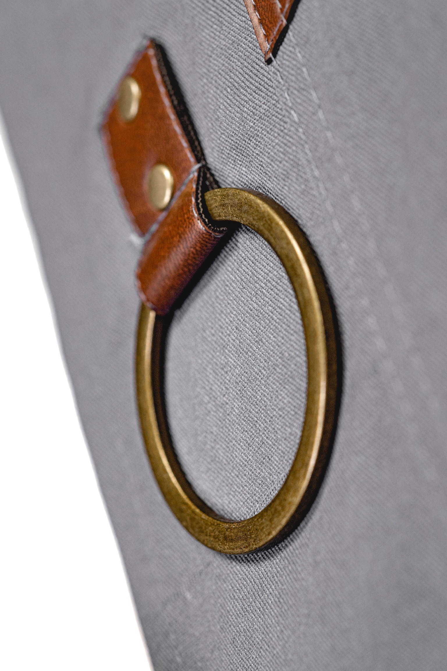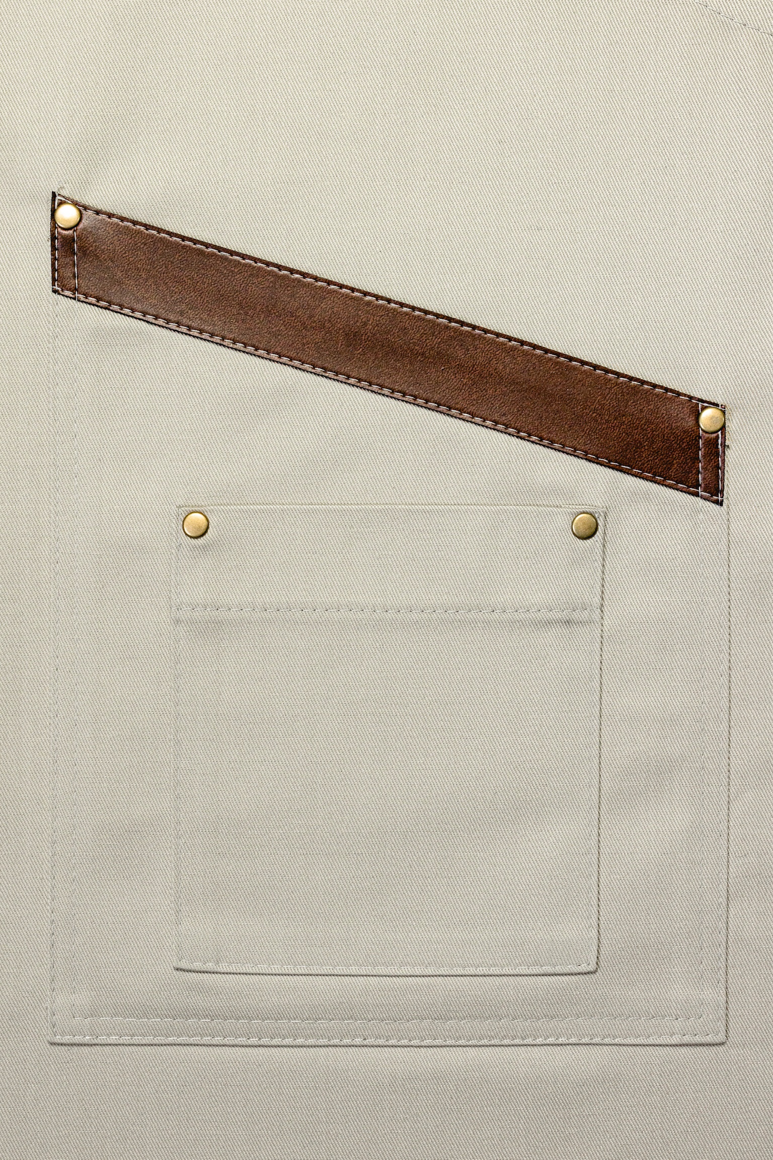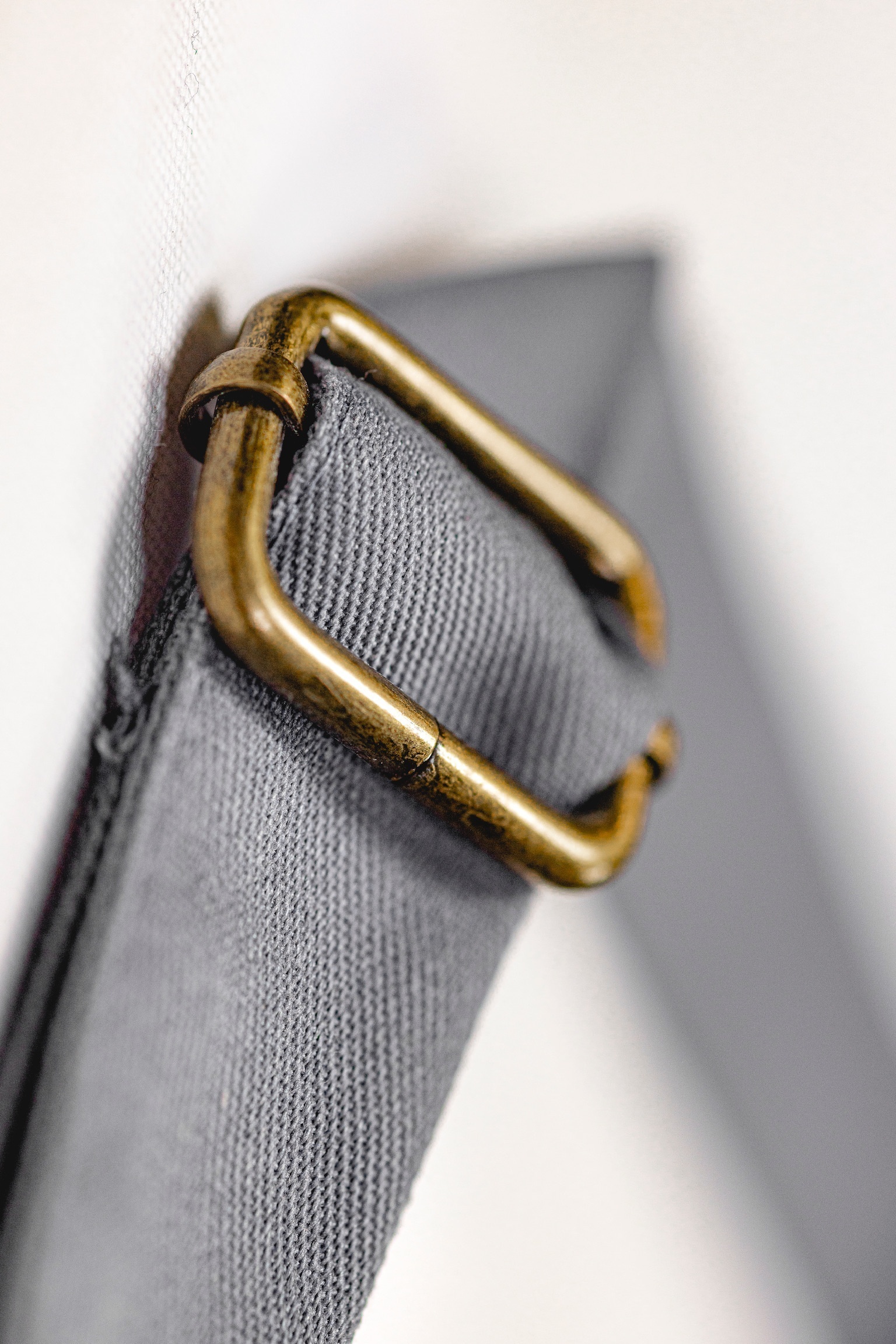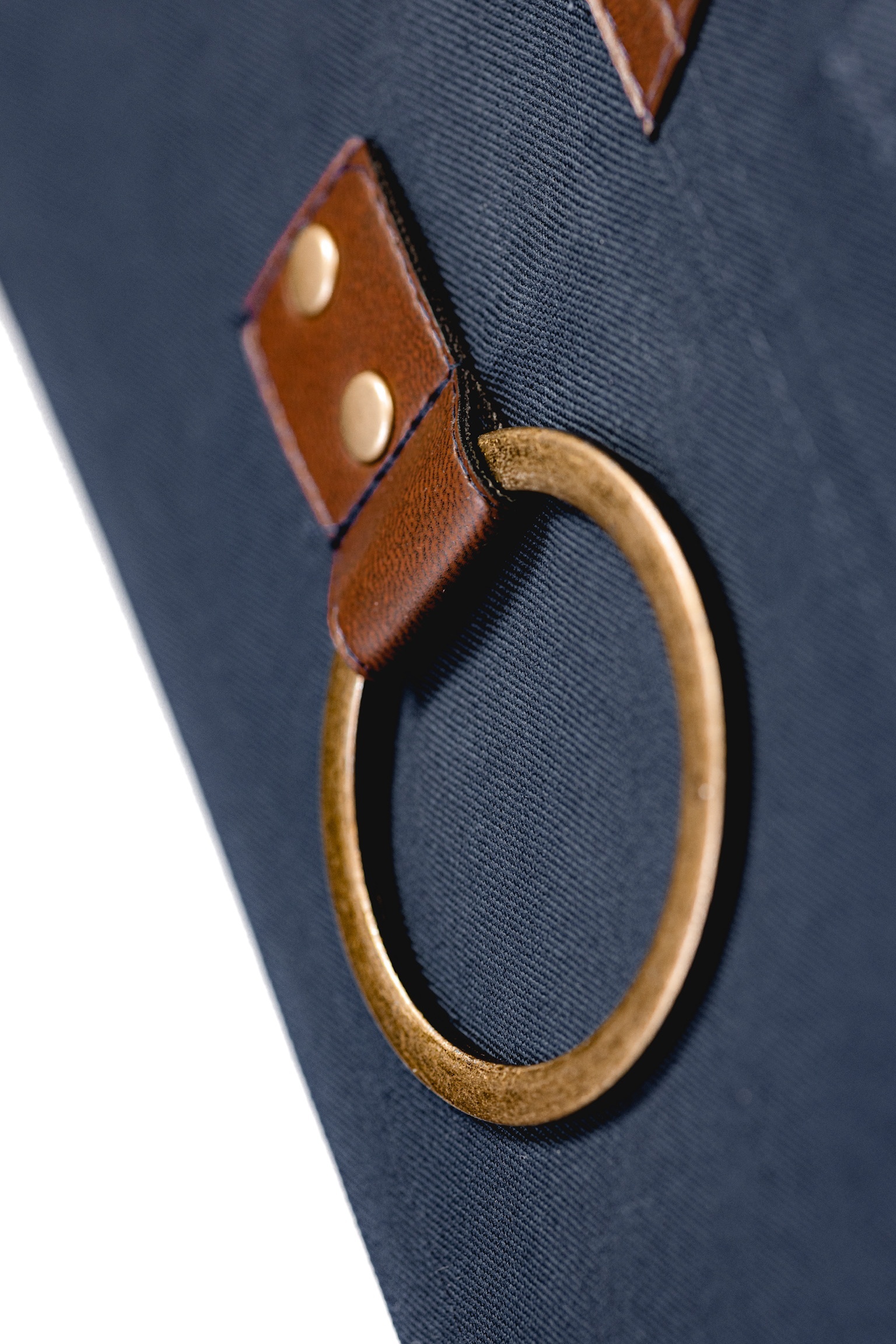 Stylowy fartuch z dużymi skośnymi kieszeniami, które pomieszczą najpotrzebniejsze przybory. Dodatkowa kieszonka na piersi. Specjalne metalowe kółeczko do zawieszenia ścierki lub otwieracza. Wzmocnienia metalowe w kolorze starego złota, które dodają szyku, ale i wzmacniają konstrukcję. Pasek na szyi ma dodaną regulację, aby każdy mógł dopasować fartuch do swojego wzrostu. Fartuch sprawdzi się w restauracji, za barem, w salonie fryzjerskim, barberskim, tatuatorskim i jako fartuch kuchenny.