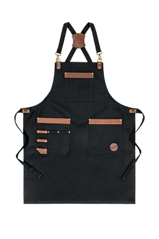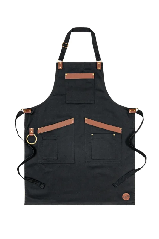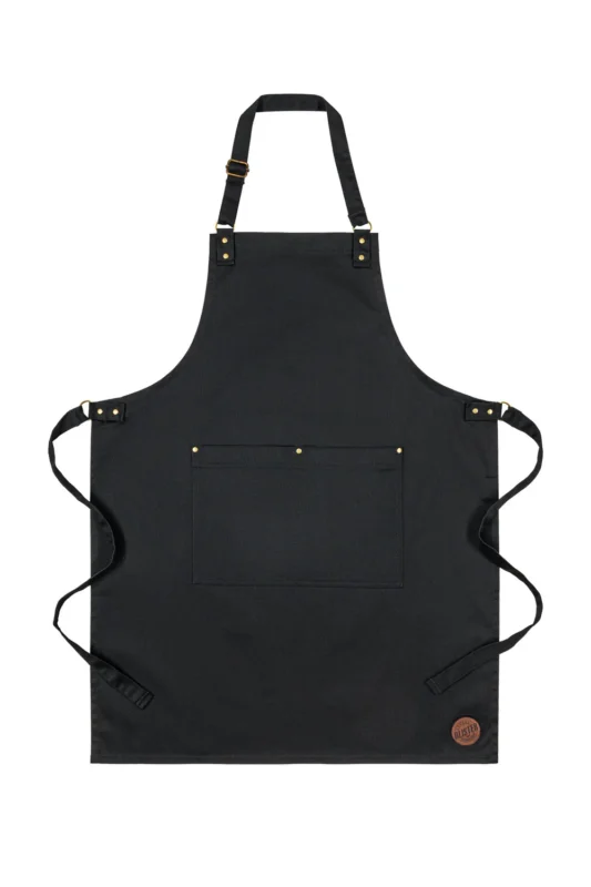 Stylowy fartuch z dużymi skośnymi kieszeniami, które pomieszczą najpotrzebniejsze przybory. Dodatkowa kieszonka na piersi. Specjalne metalowe kółeczko do zawieszenia ścierki lub otwieracza. Wzmocnienia metalowe w kolorze starego złota, które dodają szyku, ale i wzmacniają konstrukcję. Pasek na szyi ma dodaną regulację, aby każdy mógł dopasować fartuch do swojego wzrostu. Fartuch sprawdzi się w restauracji, za barem, w salonie fryzjerskim, barberskim, jako fartuch tatuatorski i kuchenny.