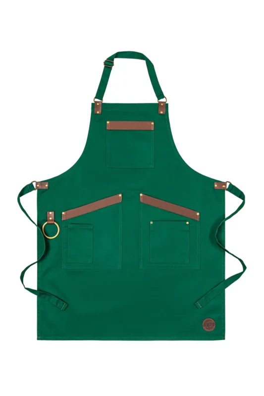 Stylowy i praktyczny fartuch z licznymi kieszonkami i mocowaniami. Wzmocnienia zrobione z metalowych nitów w kolorze antycznego złota co dodaje elegancji i trwałości całej konstrukcji. Długie materiałowe szelki z regulacją na plecach idealnie dopasowują się do każdej sylwetki.  Liczne kieszonki posłużą do przechowywania najpotrzebniejszych rzeczy i dodadzą stylu. Fartuch sprawdzi się idealnie w każdej branży.