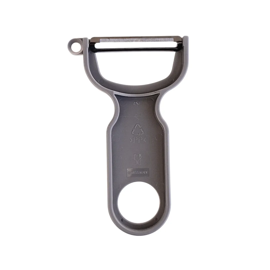 Ultracienkie ostrze ze stali nierdzewnej, wykonane w Szwajcarii, gładko prześlizguje się po powierzchni owocu, zdejmując jedynie cienką warstwę skórki bez goryczkowatego miąższu.